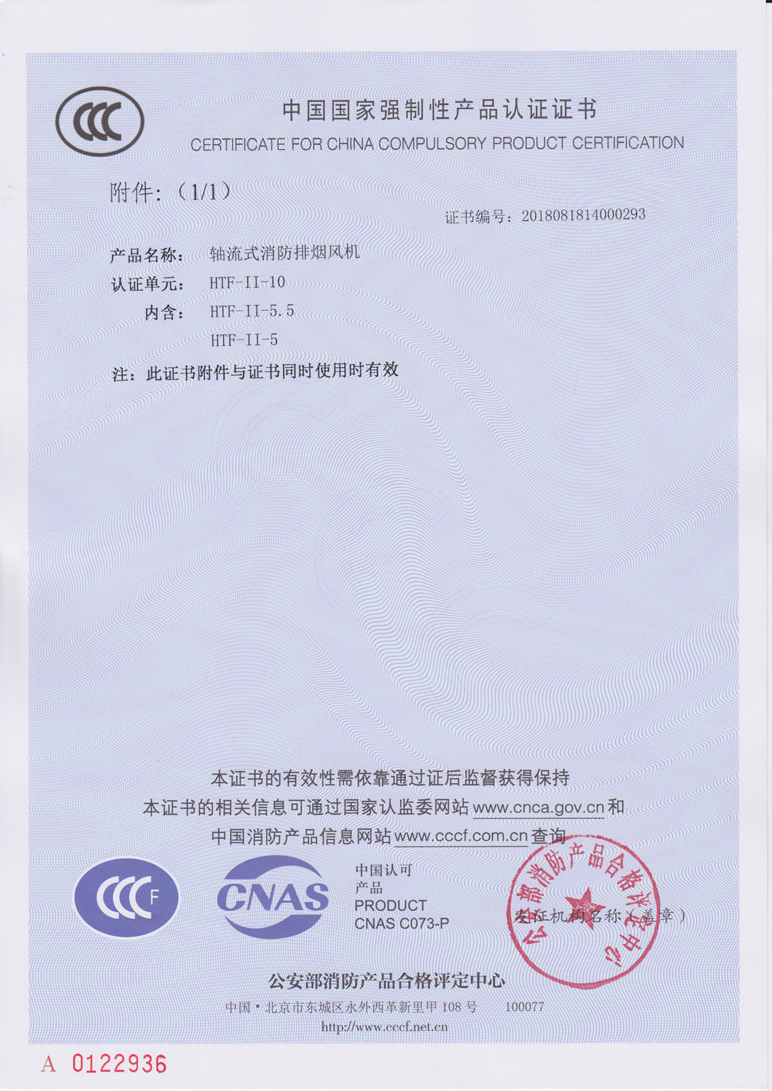 上一条:轴流式消防排烟风机(双速)HTF-II-10(主型)消防3C认证证书
