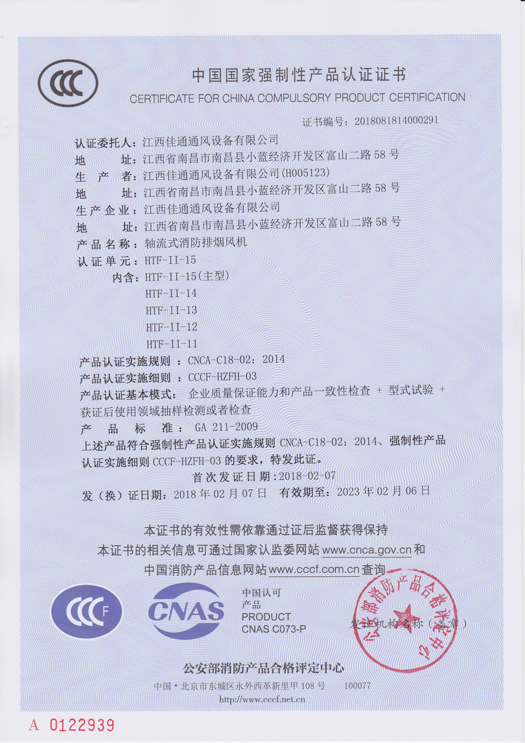 下一条:轴流式消防排烟风机(双速)HTF-II-10(主型)消防3C认证证书