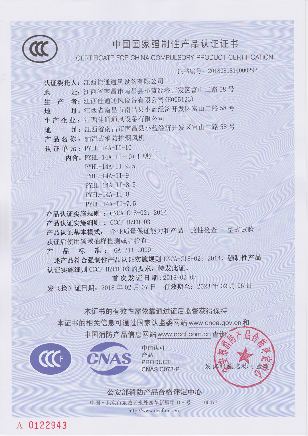 下一条:轴流式消防排烟风机(双速)PYHL-14A-II-10(分型)消防3C认证证书