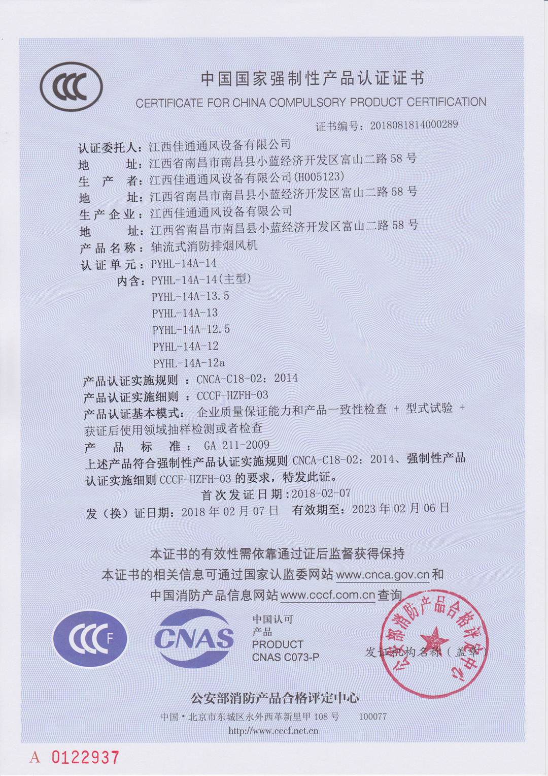 轴流式消防排烟风机PYHL-14A-14(主型)消防3C认证证书