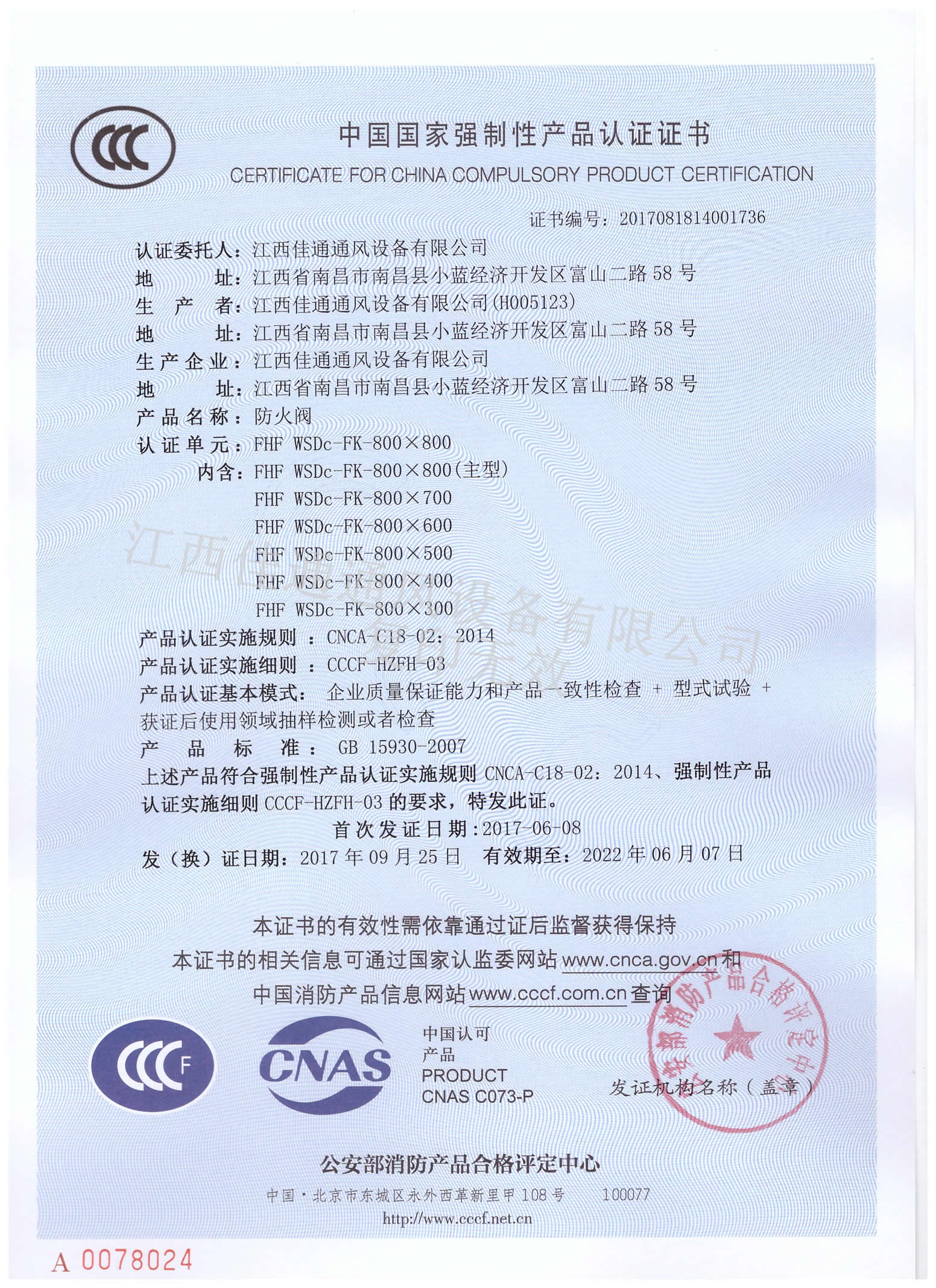 上一条:消防3C认证证书防火阀800×800(分型1)