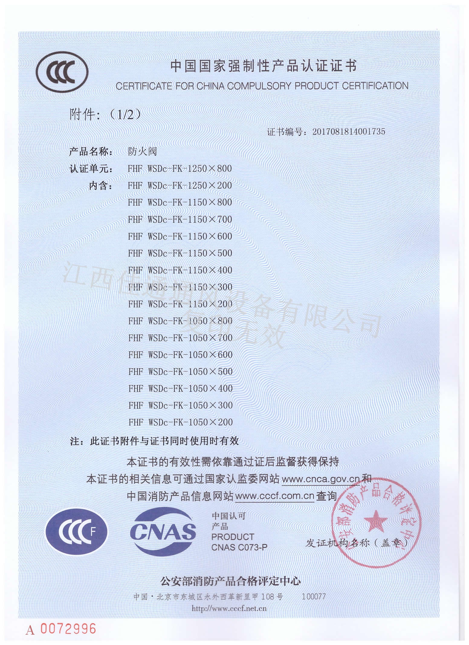 消防3C认证证书防火阀1250×800(分型1)