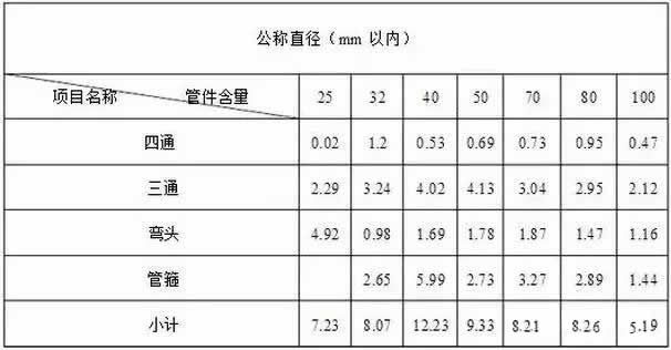 (2)、管道安装按设计管道中心长度,以“m”为计量单位,不扣除阀门、管件及各种组件所占长度。主材数量应按估价表用量计算,管件含量见表一:(镀锌钢管(螺纹连接)管件含量表单位:10m)