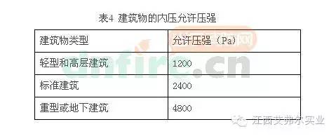 防护区内门、窗上的玻璃允许压强不应低于建筑物的允许压强。目前国内各设计部门防护区内围护结构承受内压的允许压强,无论建筑物是轻型和高层建筑,还是标准建筑及地下建筑,均设定为1.2KPa,该值的设定是依据GB50370-2005标准中3.2.6条款,参照美国NFDA12B-1980标准中给出的,若设计部门和用户需提高防护区内围护结构承受的允许压强,应由建筑设计部门试验给出。