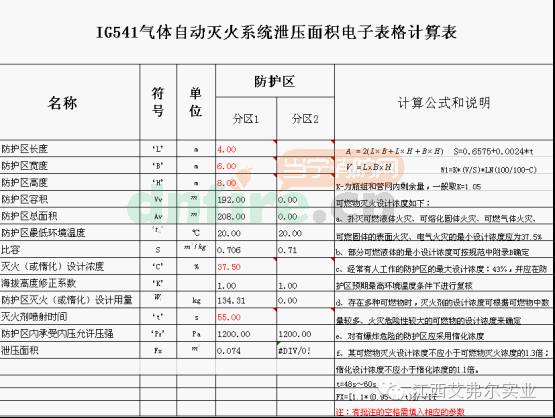 注:(1)IG541混合气体灭火系统防护区泄压口总泄压面积计算和电子表格编制方法与七氟丙烷灭火系统相同,这里不再赘述。