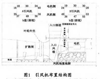 1.2.1 进、出口烟道因素。引风机布置在电除尘出口,每两个室混入一个风道,然后直通进入引风机入口风箱。任何一段与另一段膨胀产生差异,都通过伸缩节来进行补偿,补偿不够或膨胀受限,都会导致风道与设备硬接触。引风机布置结构如图1所示: