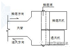 该系统通风机出风口设置防火阀,排烟机出风口设置排烟阀,风管中设置排烟阀(常开)。该系统排风与排烟的方向相反。