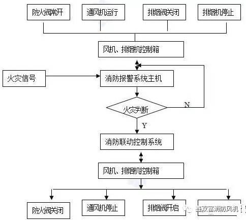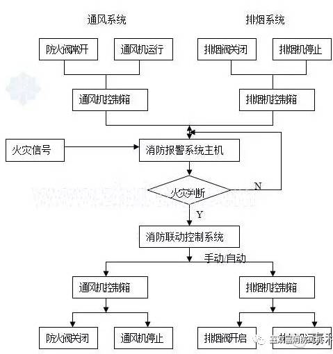 3.2.1平时该系统中防火阀为开启状态,通风机运行,完成通风功能。排烟阀为关闭状态,排烟机停止。