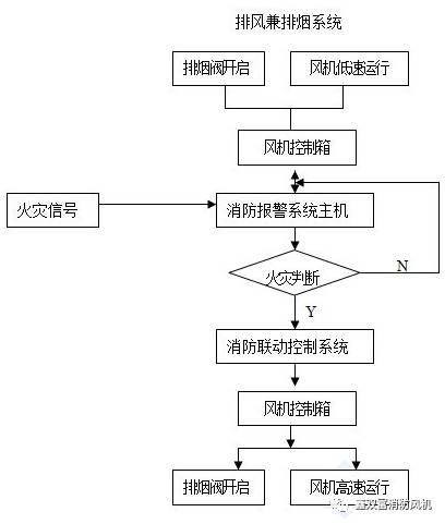 2、通风与排烟共用一套系统。在系统管道上或排风兼排烟风机的排风口处设置排烟阀,平时呈开启状态,排风兼排烟风机低速运行。一旦火灾发生时,排风兼排烟风机高速运行。