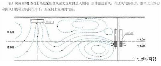 在某些高大空间内,若实际工作区在下部,则不需将整个空间都作为控制调节的对象,可采用中送风方式,可节省能耗。但这种气流分布会造成空间竖向温度分布不均匀,存在温度“分层”现象。