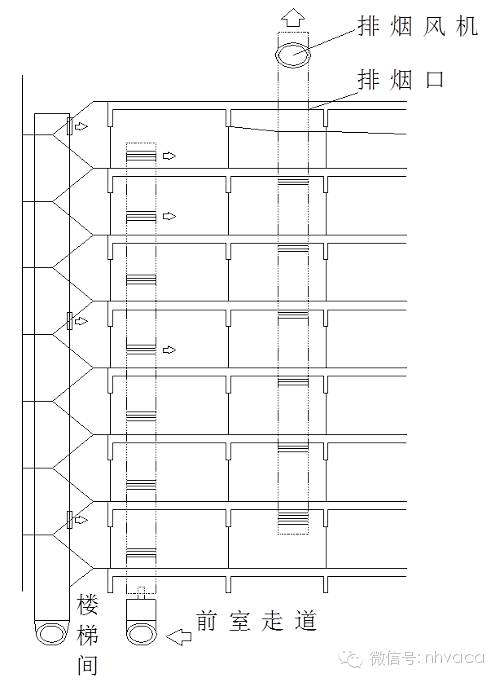 对高层的建筑来说,可采用专用的通风排烟竖井。