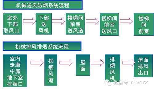 该系统的风源必须吸自室外,且不应受到烟气的污染。一般情况该系统与排烟系统共同存在,如下图示。