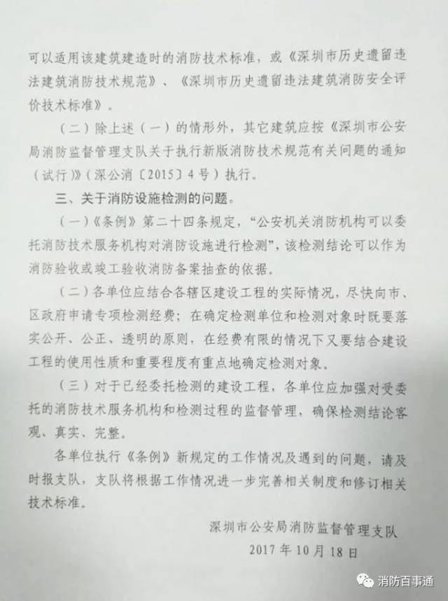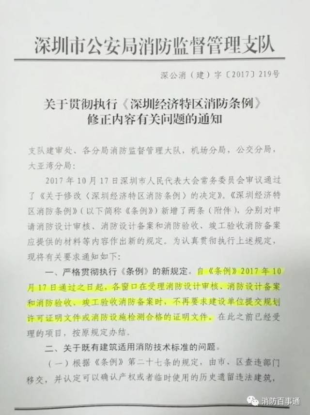 据悉,10月18日,深圳市公安局消防监督管理支队发出通知:即日起,在所有消防审批受理窗口,不再要求建设单位提交规划许可证明文件和消防设施检测合格的证明文件。