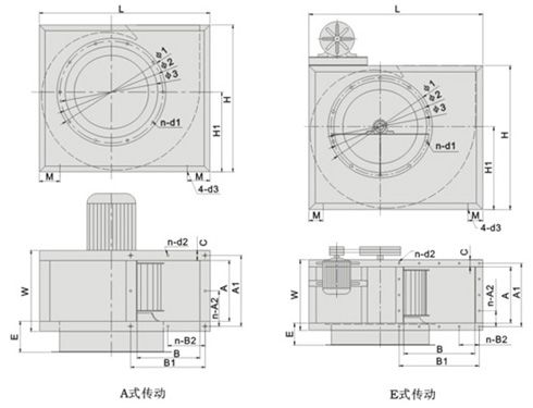 本系列风机分A式直联传动和E式皮带传动,按叶轮旋转方向分为左旋和右旋,旋转方向从电机或皮带轮侧看为准,以出风口分为00、900、1800、2700四种出风方式,订货时需注明。